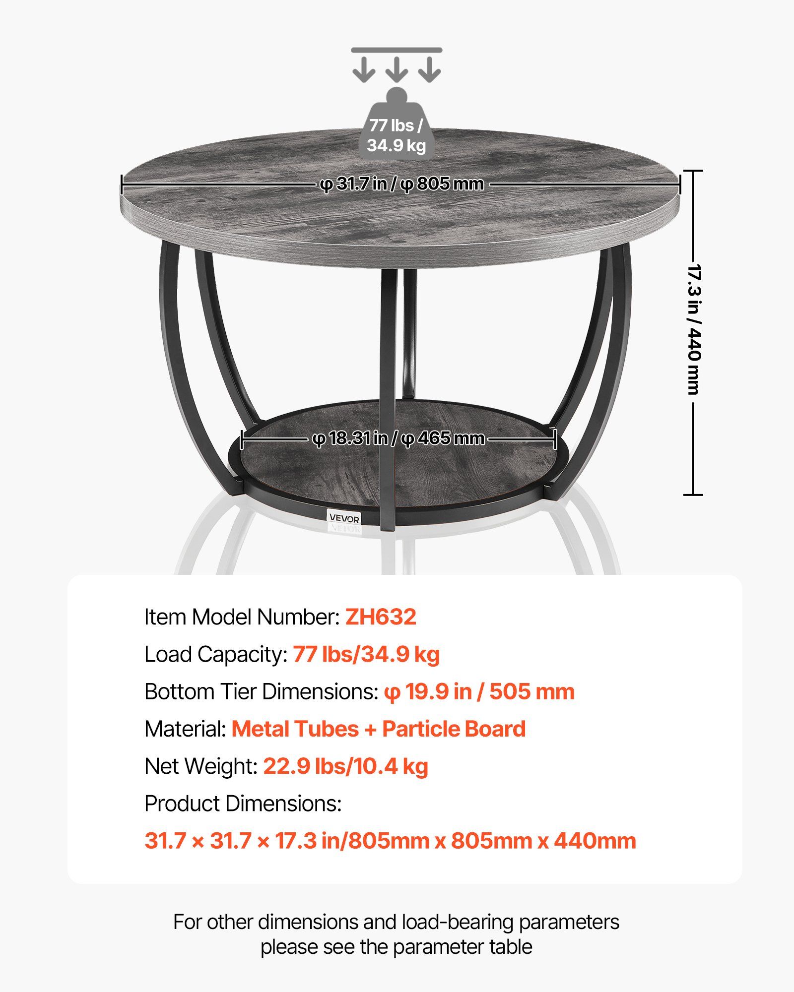 1.2-Tier Design: Providing a diameter of 31.6 in/80.5 cm tabletop, the round coffee table holds books, water cups, laptops, and snacks. It adds an 18.3 in/46.5 cm lower storage space at the bottom to store daily small items, improving storage efficiency