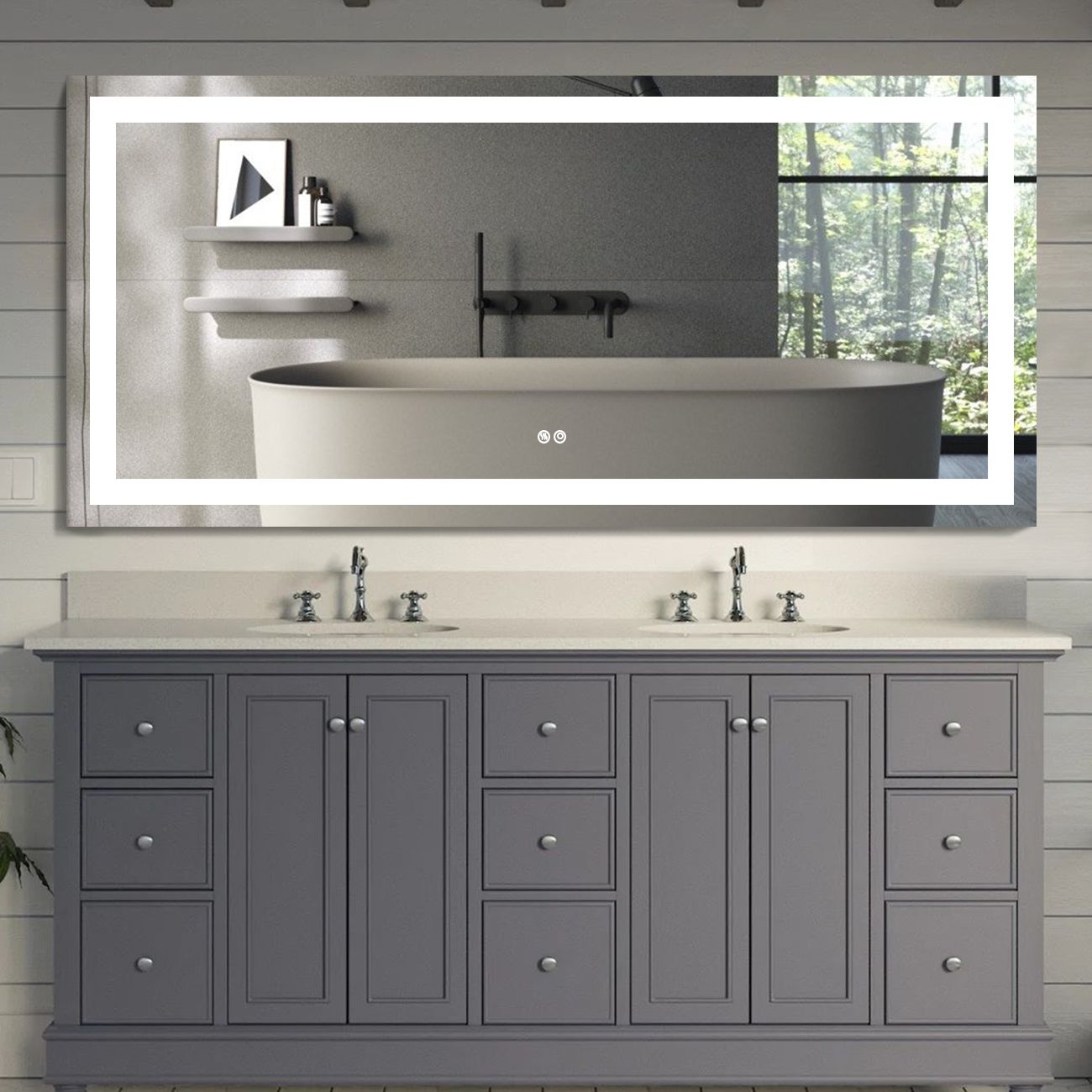 The bathroom mirror with LED light; Made of high qualit Anodized aluminum can be used for long time. High tech Intelligent bathroom vanity makeup mirror with defogging function. Touch sensor button can adjustable mirror color brightness from 2700K-6300K to meet the needs of different light. Brightness can be adjusted freely from 10 % to 100%. Large size bathroom mirrors wall mounted design; it is space-saving. Bright mirror can make your bathroom or living room can be more spacious; Better mood. Perfect for bathroom; bedroom; dressroom; powder room and more.